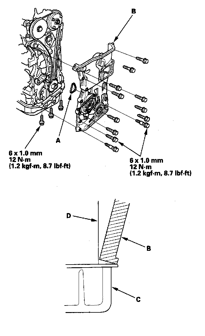 Install the new O-ring (A) on the chain case. Set the edge of the chain case (B) to the edge of the oil pan (C), then install the chain case on the engine block (D). Wipe off the excess liquid gasket on the oil pan and chain case mating area.