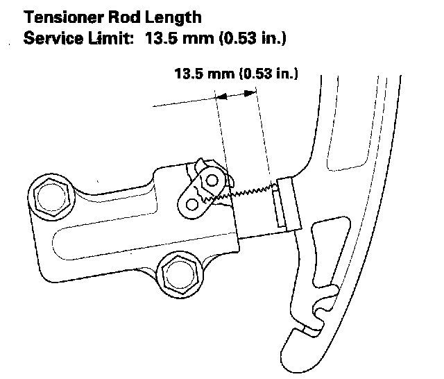 16. Measure the tensioner rod length between the tensioner body and bottom of the flat surface section on the tensioner rod. If the length is more than the service limit, replace the cam chain and the oil pump chain.
