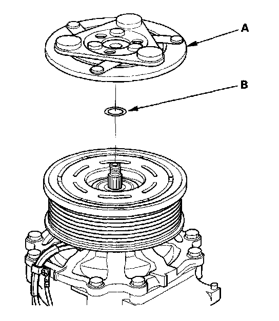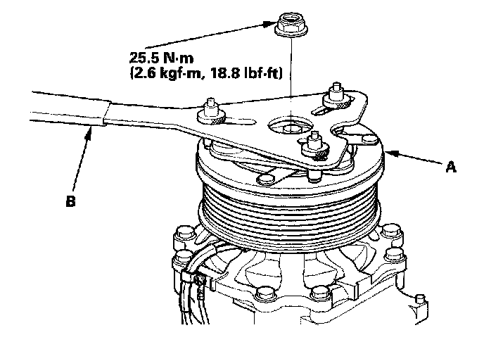 1. Remove the center nut while holding the armature plate (A) with a commercially available A/C clutch holder (B).