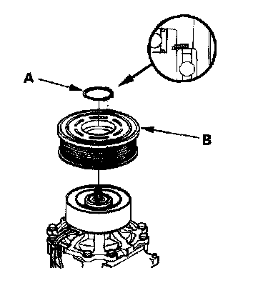 3. If you are replacing the field coil, remove the snap ring (A) with snap ring pliers, then remove the rotor pulley (B). Be careful not to damage the rotor pulley and A/C compressor.