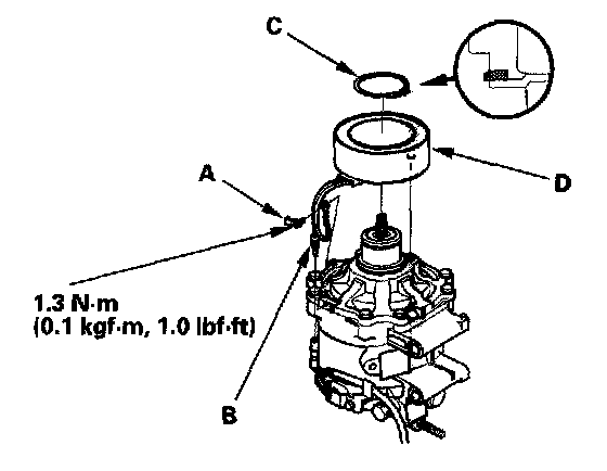 4. Remove the bolt and holder (A), then disconnect the field coil connector (B). Remove the snap ring (C) with snap ring pliers, then remove the field coil (D). Be careful not to damage the field coil and A/C comoressor.