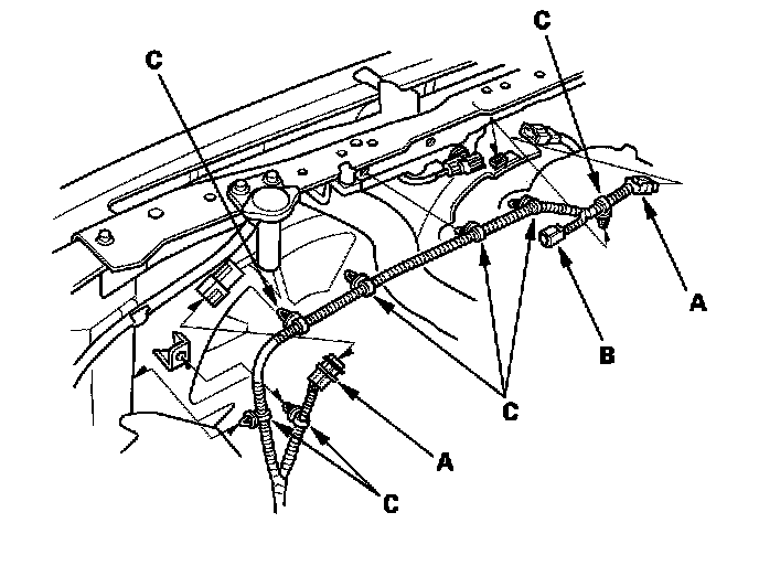 6. Disconnect the fan motor connectors (A) and hood switch connector (B), then remove the harness clamps (C).