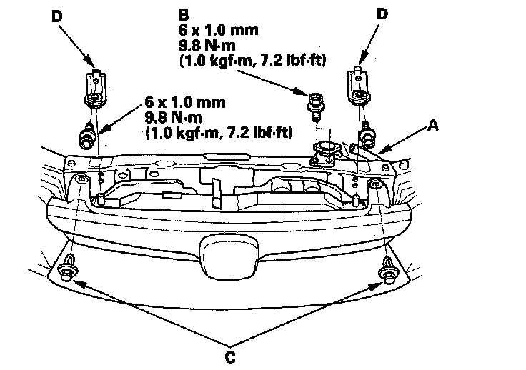 7. Remove the reservoir hose (A), radiator cap base mounting bolts (B), clips (C), and radiator upper brackets (D).