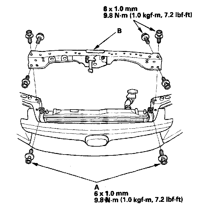 12. Remove the condenser bracket mounting bolts (A), then remove the bulkhead (B).