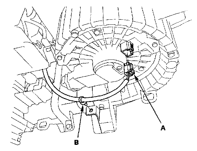 9. Disconnect the connector (A) from the blower motor. Remove the wire harness clip (B).