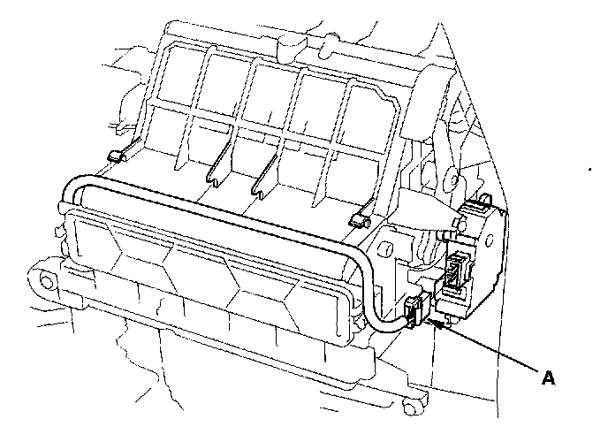 11. Disconnect the connectors (A) from the mode control motor, the evaporator temperature sensor, and the power transistor. Remove the wire harness clips (B).