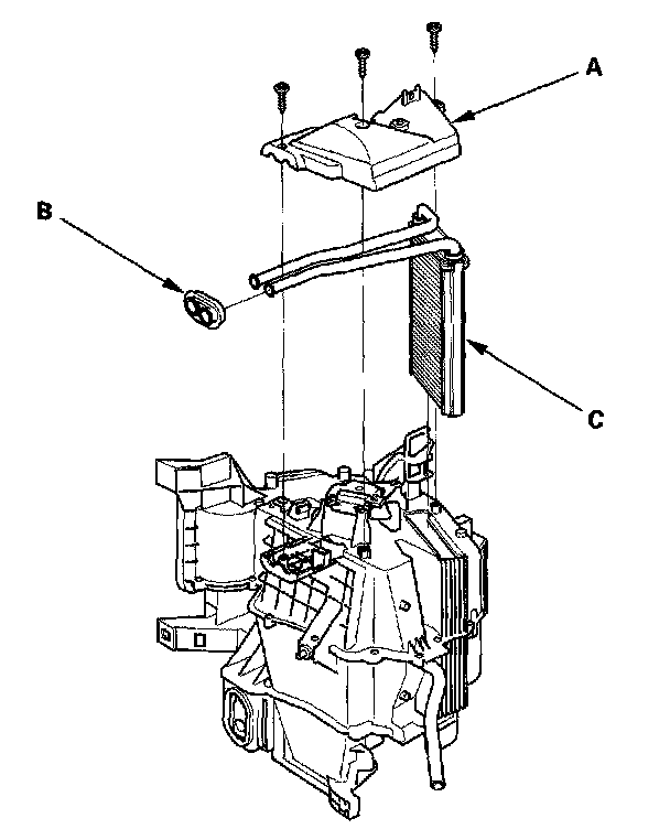 14. Remove the self-tapping screws, the heater core cover (A), the grommet (B), and carefully pull out the heater core (C).