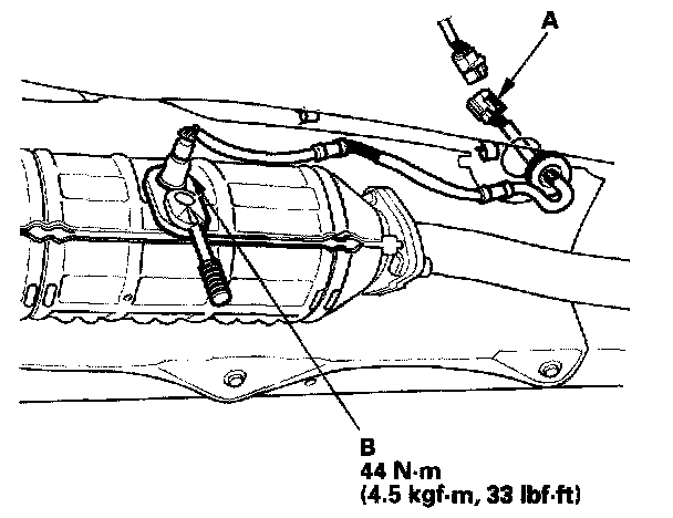1. Disconnect the secondary HO2S 4P connector (A), then remove the secondary HO2S (B).