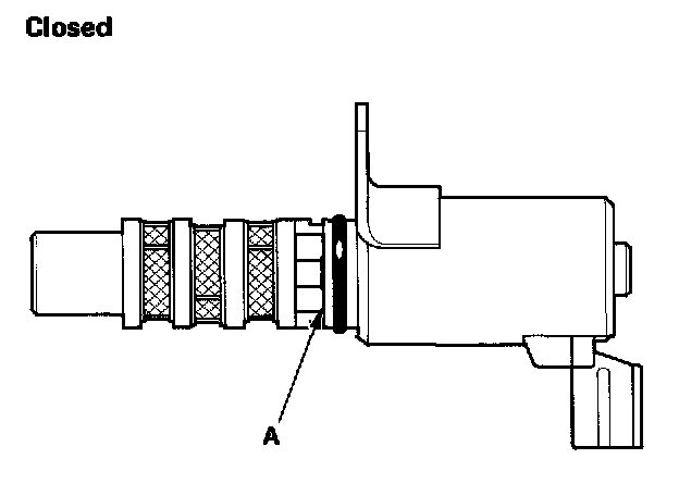 7. Connect the battery negative terminal to VTC oil control solenoid valve 2P connector terminal No. 1. Appearance of inner valve (A) in the port should be at least 1/16 in. (1.2 mm). If the inner valve does not open, replace it; then go to step 7.