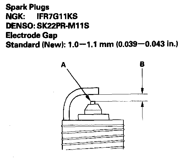 3. Replace the plug at the specified interval, or if the center electrode is rounded (A), or if the spark plug gap (B) is out of specification. Use only the listed spark plugs.