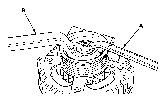 3. If the front bearing needs replacing, remove the pulley locknut with a 10 mm wrench (A) and a 22 mm wrench (B). If necessary, use an impact wrench.