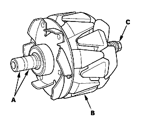 15. Check for continuity between each slip ring and the rotor (B) and the rotor shaft (C).