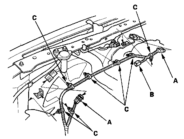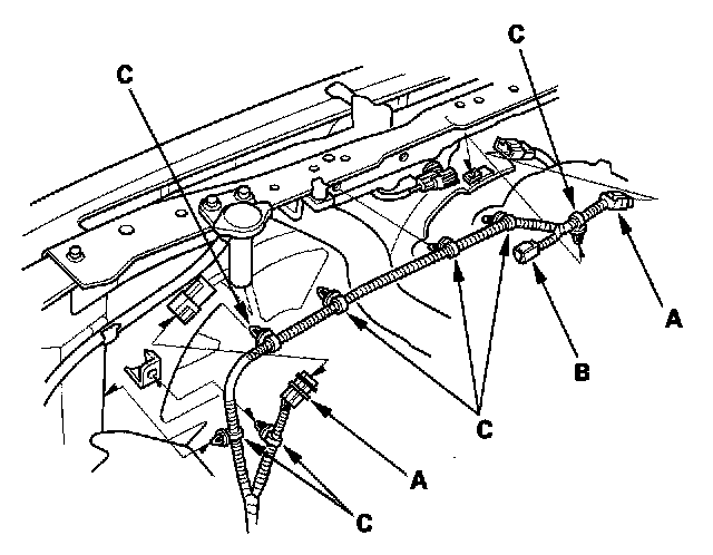 5. Disconnect the fan motor connectors (A) and hood switch connector (B), then remove the harness clamps (C).
