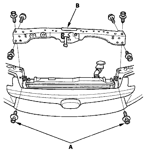 7. Remove the condenser bracket mounting bolts (A), then remove the bulkhead (B).