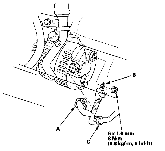9. Disconnect the alternator connector (A), BLK wire (B) and harness clamp (C) from the alternator, then remove the alternator.
