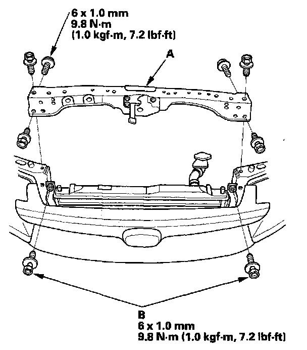 3. Install the bulkhead (A), then install the condenser bracket mounting bolts (B).