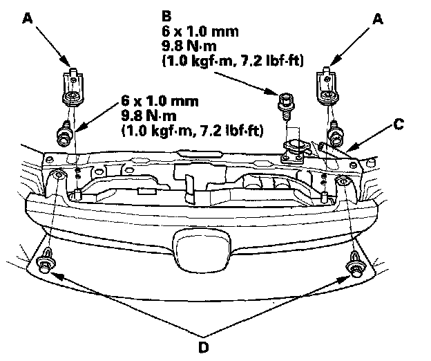 6. Remove the reservoir hose (A), radiator cap base mounting bolts (B), clips (C) and radiator upper brackets (D).