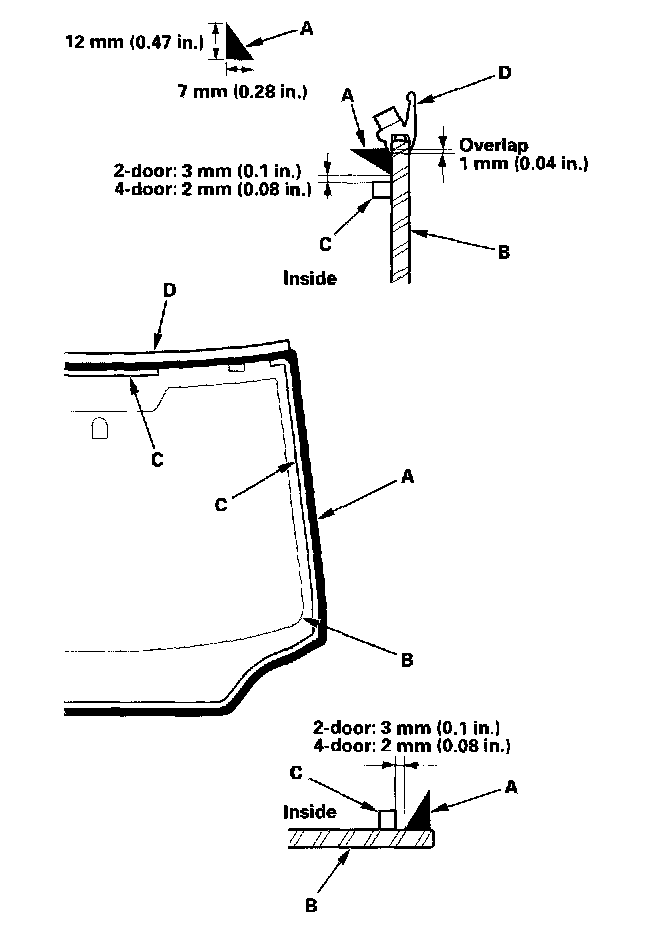 20. Pack adhesive into the cartridge without air pockets to ensure continuous delivery. Put the cartridge in a caulking gun, and run a bead of adhesive (A) around the edge of the windshield (B) between the dams (C) and molding (D) as shown. Apply the adhesive within 30 minutes after applying the glass primer. Make a slightly thicker bead at each corner.