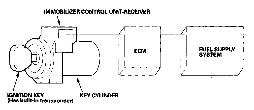 When the key is inserted in the ignition switch and turned to the on (II) position, the immobilizer control unit-receiver sends power to the transponder in the ignition key. The transponder then sends a coded signal back to the immobilizer control unit-receiver, which then sends a coded signal to the ECM. The code is a rolling type embedded in the immobilizer control unit-receiver instead of the ECM.