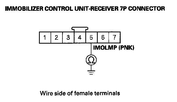 11. Check for continuity between the immobilizer control unit-receiver 7P connector No. 5 (IMOLMP) terminal and body ground.