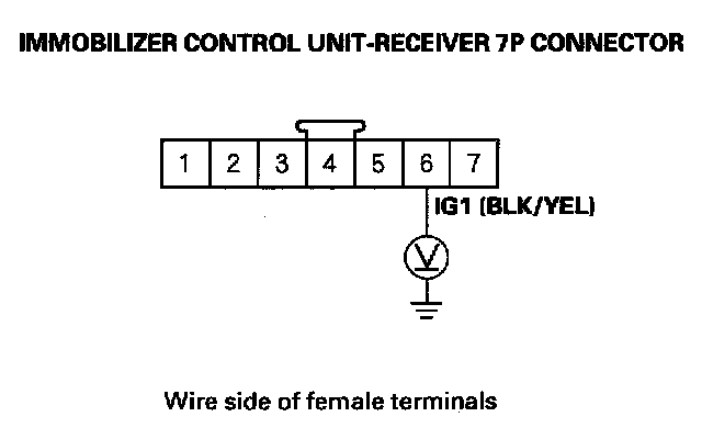 22. Check for voltage between the immobilizer control unit-receiver 7P connector No. 6 (IG1) terminal and body ground.
