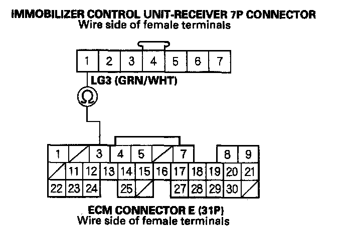 26. Check for continuity between the immobilizer control unit-receiver 7P connector No. 1 (LG3) terminal and ECM connector E (31P) No. 3 (LG3) terminal.