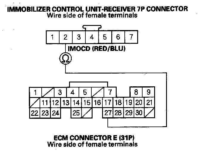 40. Check for continuity between the immobilizer control unit-receiver 7P connector No. 2 (IMOCD) terminal and ECM connector E (31P) No. 27 (IMOCD) terminal.