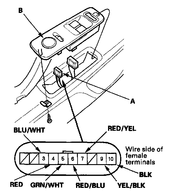 2. Disconnect the 10P connector (A) from the power mirror switch (B), and inspect the terminals. If the terminals are OK, go to step 3.