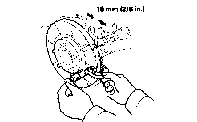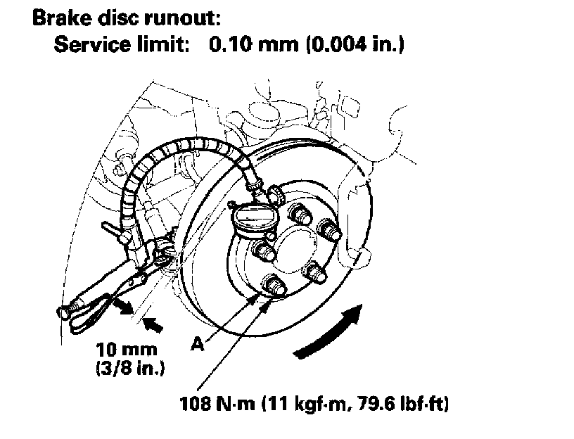 5. Install wheel nuts and suitable flat washers (A) to hold the disc securely against the hub, then mount a dial indicator as shown, and measure the runout at 10 mm (3/8 inch) from the outer edge of the brake disc.