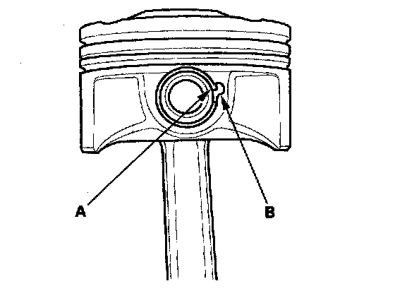 2. Apply new engine oil to the piston pin snap rings (A), and turn them in the ring grooves until the end gaps are lined up with the cutouts in the piston pin bores (B).