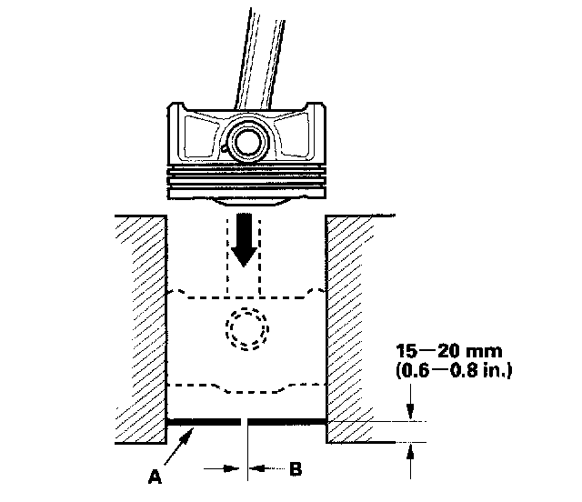 4. Using a piston, push a new ring (A) into the cylinder bore 15 - 20 mm (0.6 - 0.8 inch) from the bottom.