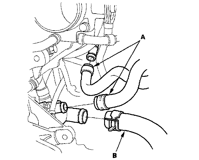 10. Install the heater hoses (A) and lower radiator hose (B).