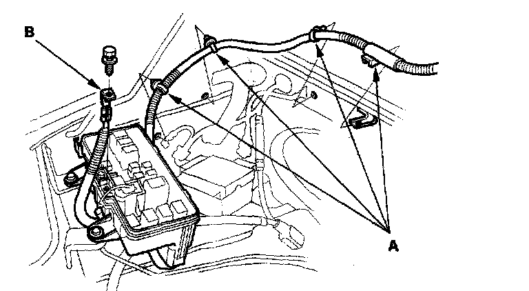 16. Install the harness clamps (A), then install the battery cable (B) on the main under-hood fuse/relay box.