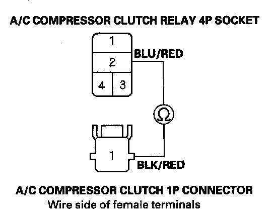 16. Check for continuity between the No. 2 terminal of the A/C compressor clutch relay 4P socket and the No. 1 terminal of the A/C compressor clutch 1P connector.