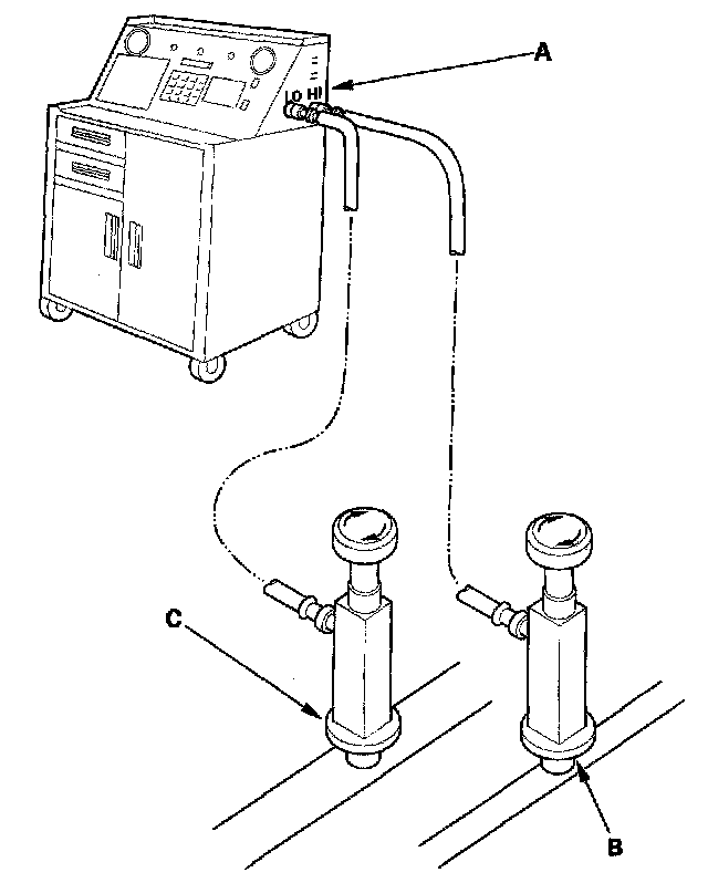 1. Connect an R-134a refrigerant recovery/recycling/charging station (A) to the high-pressure service port (B) and the low-pressure service port (C), as shown, following the equipment manufacturer's instructions.