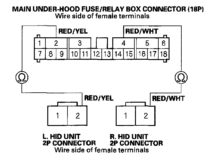 16. Check for continuity between the No. 2 (left) and No. 4 (right) terminals of the main under-hood fuse/relay box connector (18P) and the No. 2 terminal of the appropriate HID unit 2P connector.