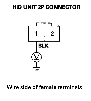 14. Measure the voltage between the No. 2 terminal of the HID unit 2P connector and body ground.