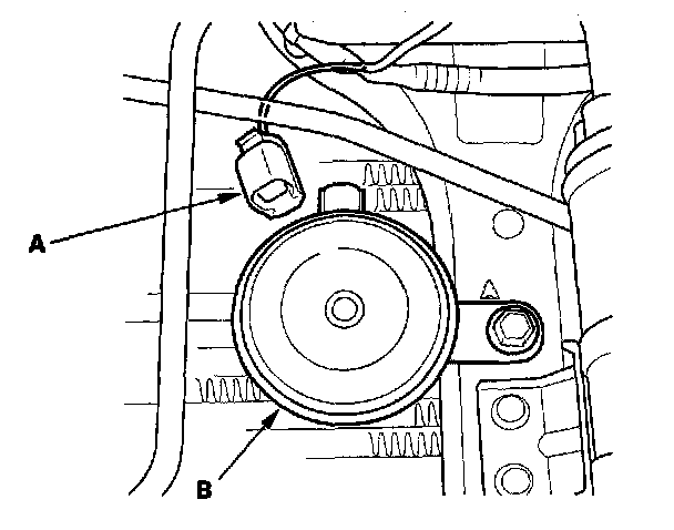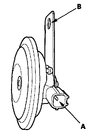 4. Test the horn by connecting battery power to the terminal (A) and grounding to the bracket (B). The horn should sound.