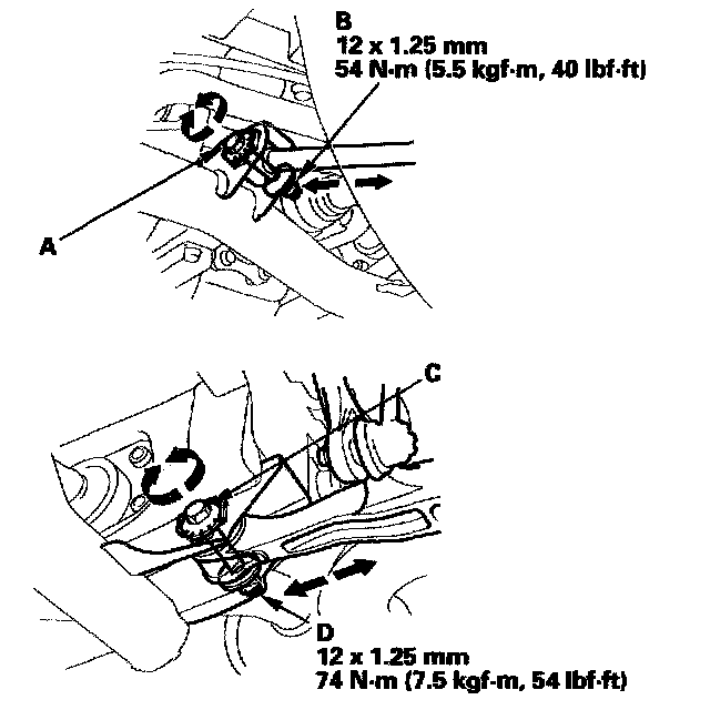 3. Hold the adjusting bolt of the control arm (A), and loosen the self-locking nut (B). Hold the adjusting bolt of the lower arm (C), and loosen the self-locking nut (D).
