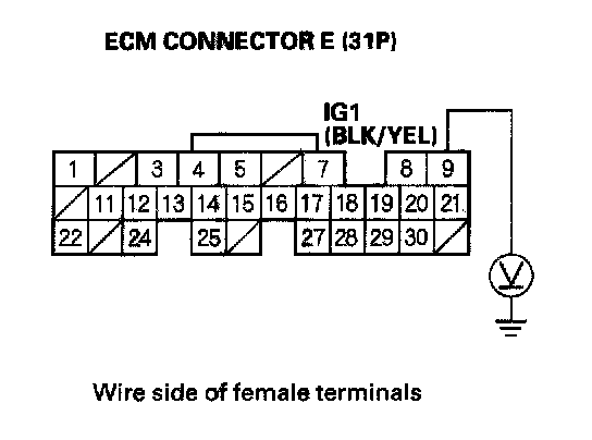 58. Measure voltage between ECM connector terminal E9 and body ground.