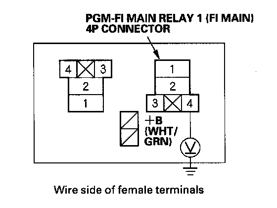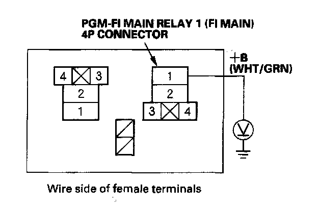 62. Measure voltage between PGM-FI main relay 1 (FI MAIN) 4P connector terminal No. 4 and body ground.