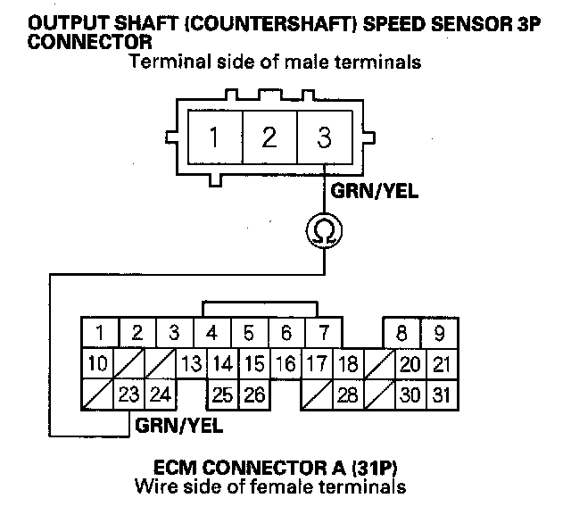 4. Check for continuity between the output shaft (countershaft) speed sensor 3P connector No. 3 terminal and ECM connector A (31P) No. 23 terminal.