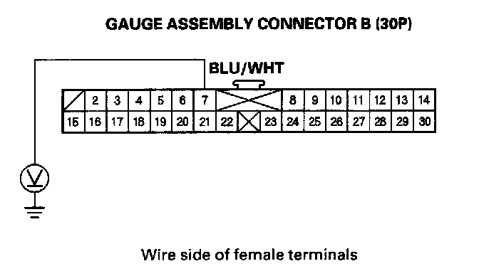 8. Measure voltage between the gauge assembly connector B (30P) No. 7 terminal and body ground.