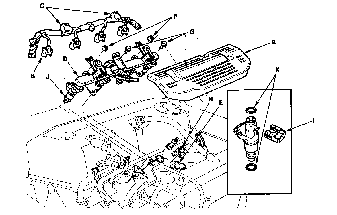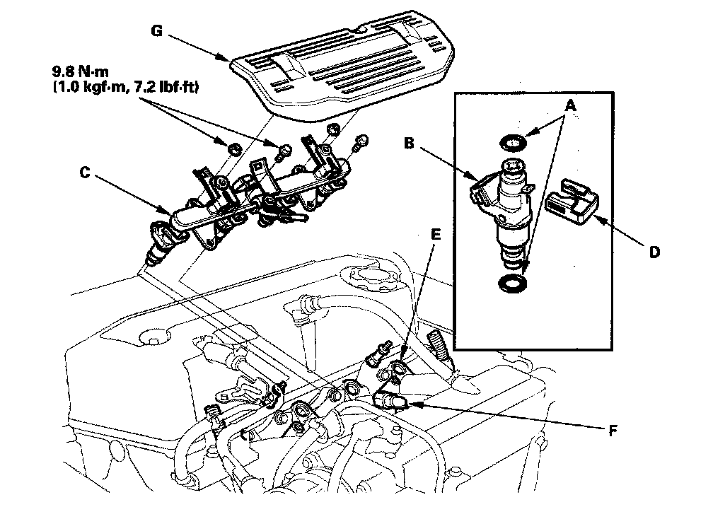 5. Remove the retainer nuts (F) and bolts (G) from the fuel rail.
