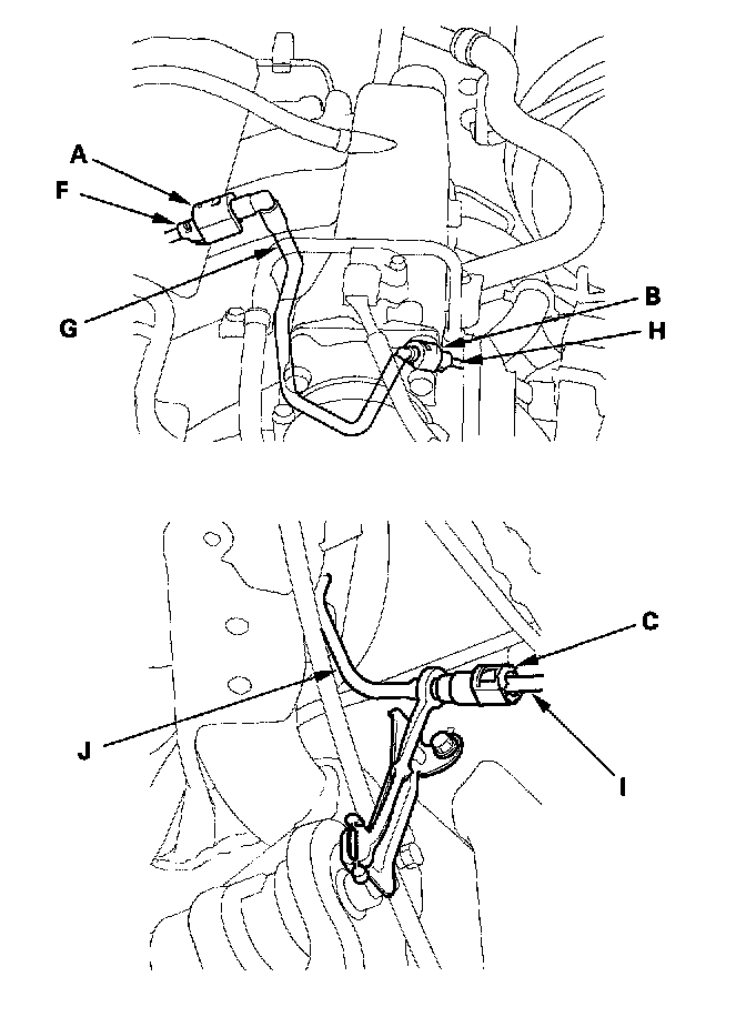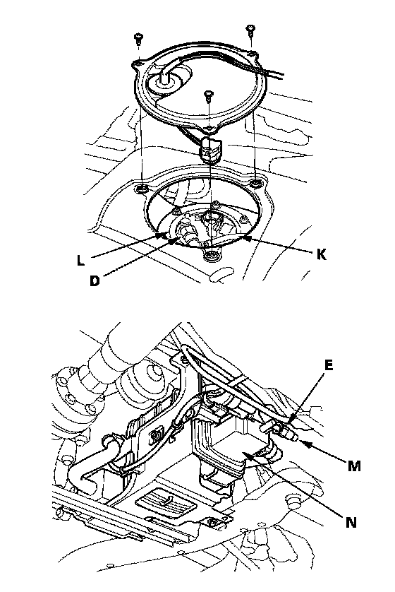Fuel Line/Quick-Connect Fitting PrecautionsThe fuel tube/quick-connect fittings (A), (B), (C), (D), (E) connect the fuel rail (F) to fuel feed hose (G), the fuel feed hose to the fuel line (H), the fuel line (I) to the fuel feed hose (J), the fuel feed hose (K) to the fuel tank unit (L), and fuel vapor line (M) to the EVAP canister (N). When removing or installing the fuel feed hose, the fuel tank unit or the fuel tank, it is necessary to disconnect or connect the quick-connect fittings. Pay attention to the following: