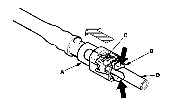 3. Hold the connector (A) with one hand and squeeze the retainer tabs (B) with the other hand to release them from the locking pawls (C). Pull the connector off.