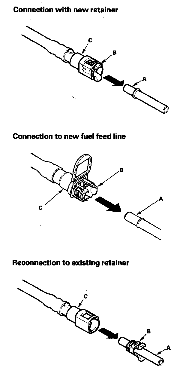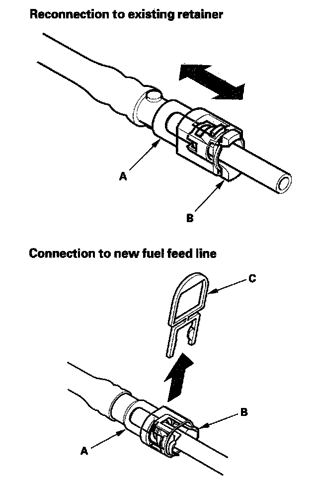 5. When you reconnect the connector (A) with the old retainer, make sure the connection is secure and the tabs (B) are firmly locked into place; check visually and also by pulling the connector. When you replace the fuel line with a new one, make sure you remove the ring pull (C) upwards after you confirm the connection is secure.