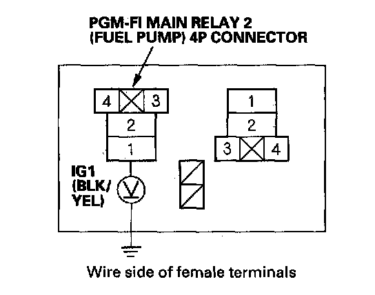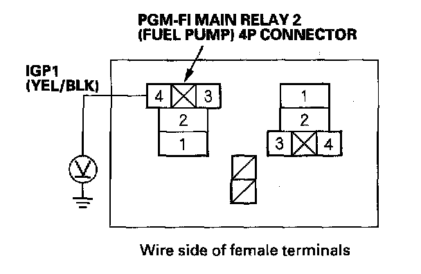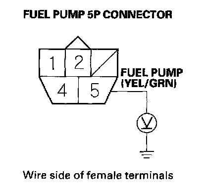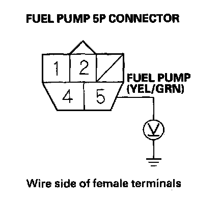 5. Measure voltage between PGM-FI main relay 2 (FUEL PUMP) 4P connector terminal No. 1 and body ground.