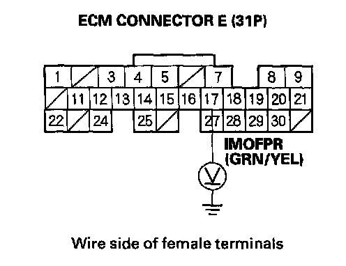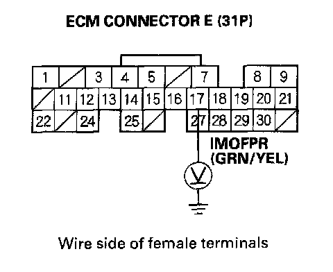 20. Turn the ignition switch ON (II), and measure voltage between ECM connector terminal E17 and body ground within 2 seconds.