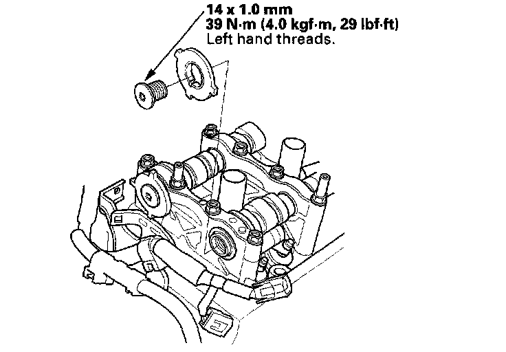 2. Hold the exhaust camshaft with an open-end wrench, then loosen the bolt.